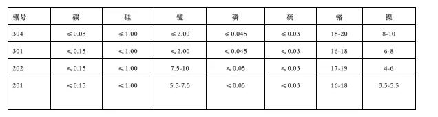 不銹鋼在冶煉過程當中,由于加入合金元素品種不同,不同品種加入量的不同。其特性也是不同的,為了加以區(qū)別則冠上了不同的鋼號,下面是常見裝飾用不銹鋼不同鋼號“合金元素”含量表僅供參考: